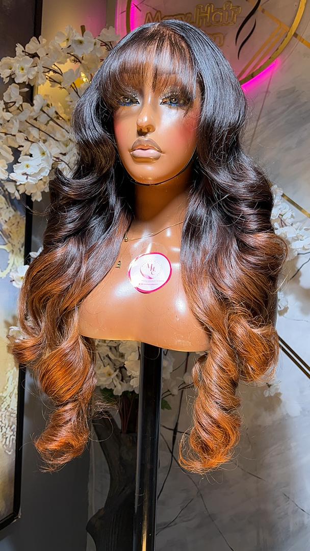 26” Virgin Bounce Wig with 5×5 fringe closure — 350g of custom-colored virgin hair for a full, bouncy, and elegant finish.
